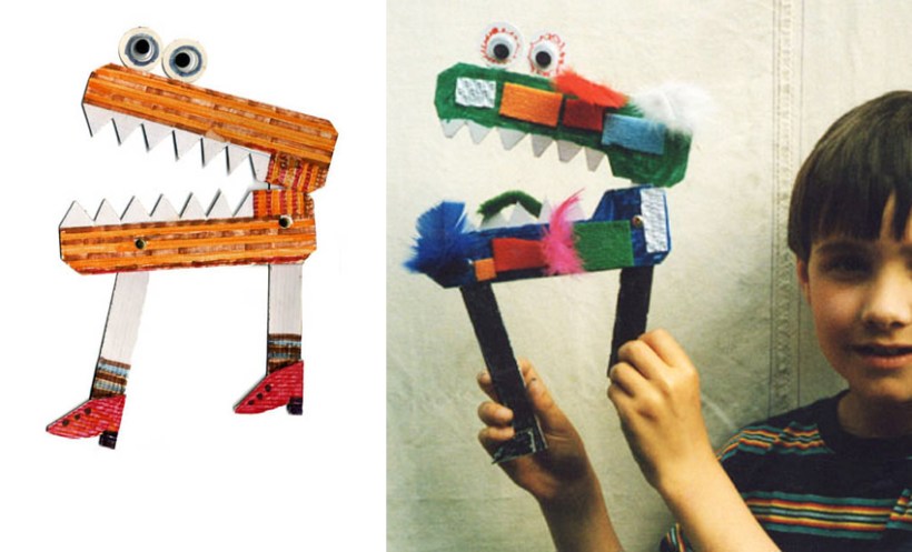 The cardboard monster’s mouth snaps open and closed using ‘split pin’ paper fasteners and a very simple pivot and lever type mechanism.