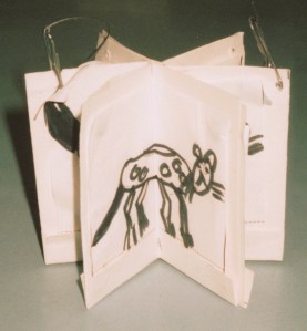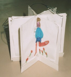 Start very simple – eg. a wriggly caterpillar, a thumping heart, or a stick figure person. It takes 4 steps to go from the start of the movement to the end, and then 2 more steps back to the beginning – 6 images in all.